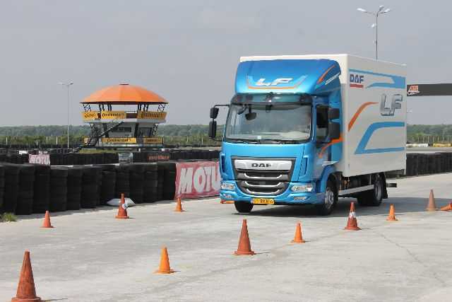 Imediat după aceea mi-a atras atenţia o porţiune de pe circuit plină de jaloane, unde un DAF mai mic, modelul LF, făcea ture fără pauze. Era zona amenajată special pentru cei care doreau să participe la o probă cronometrată. Era plin de şoferi de la firme de distribuţie, curiera, toţi dornici să scoată un timp cât mai bun. Noile DAF LF cu motor PX şi cutie manuală cu cinci trepte au fost gândite tocmai pentru jungla urbană.
