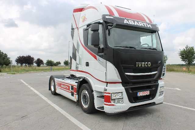 Desenat manual, pe acest model special Iveco Stralis regăsim, evident, culorile specifice mărcii Abarth, alb, gri şi roşu, toate într-o combinaţie care include steagul caroiat şi dungile sportive.