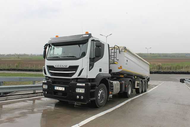 față a două motoare hidrostatice, cuplate fie automat, fie manual care îți oferă posibilitatea de a ieși din acea situație neplăcută. El permite rularea cu viteze de până la 22 km/h, o viteză maximă mai mult decât suficientă pentru un șantier.”, a mărturisit Radu Apostu, de la Iveco România. Participanții la această manifestare au putut testa “pe viu” acest sistem pe circuitul Academiei “Titi Aur”, exersând porniri pe o rampă abruptă, cu asfalt intens udat, la volanul unei autobasculante IVECO STRALIS X-WAY cu o greutate de 40 de tone.
